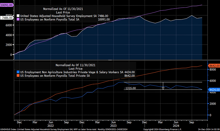 Private employment lost 1.3mn of jobs in the last year and a half, according to household survey. Total private household employment is up 4.4mn in the last 3 years. That compares to 10mn of private and public jobs added, according to NFP survey.