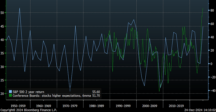 The index jumped 55% over the last 2 years – one of the best runs ever. That unsurprisingly entrenched into most recent consumer expectations and boosted actual net worth.
