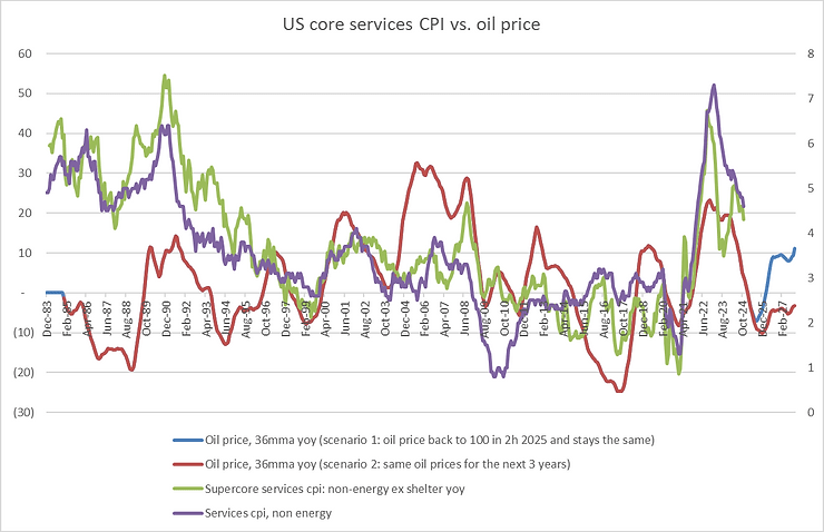 And oil/natural gas prices are not just part of headline CPI, but are important contributors to non-energy services ex-shelter CPI too. Energy plays a key role in services like transportation (air tickets), recreation (restaurants, beauty saloons), accommodation (hotels or short term rentals). In a scenario when oil prices stays the same for the next 3 years at $70/bbl, services CPI should be trending down. Unless oil jumps back above $100, the risk of the second wave of inflation is minimal.
