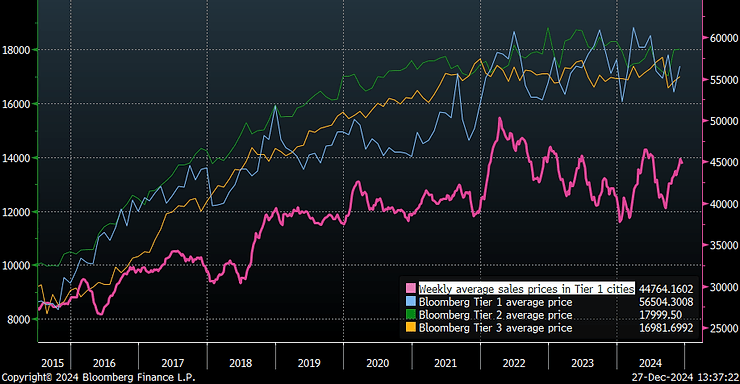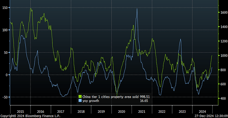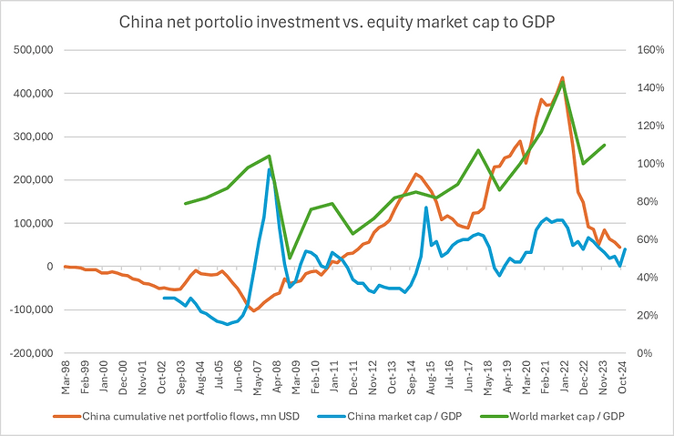 Net portfolio flows out of China have been negative since the end of 2021. Similarly China market cap to GDP peaked during the same period. It now stands at around 55%, compared to 110% of global market cap to GDP ratio. China is significantly underowned, while government is prepared to stimulate internal demand and the main source of deflation, property market, is showing signs of bottoming.