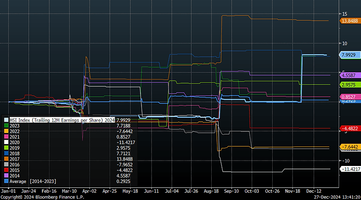 Corporate earnings are improving. HSI trailing 12m EPS is up 8% year-to-date.