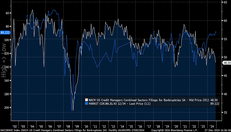 Defaults are rising in various parts of the world and asset classes, while credit risk premium remains too complacent. Leveraged loans defaults and distressed exchanged are rising towards four year highs, as rates stay restrictive. And despite looser credit standards.