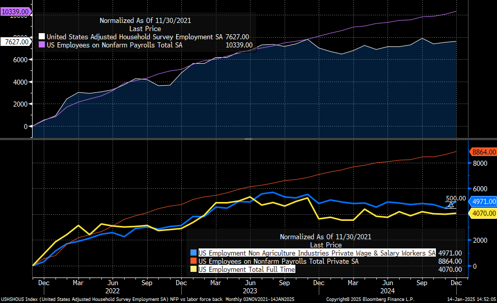 Household survey registered a strong increase in private employment in December: +500k of private non agriculture jobs. Nonetheless, full time employment has barely moved. Household survey is further diverging from NFP.