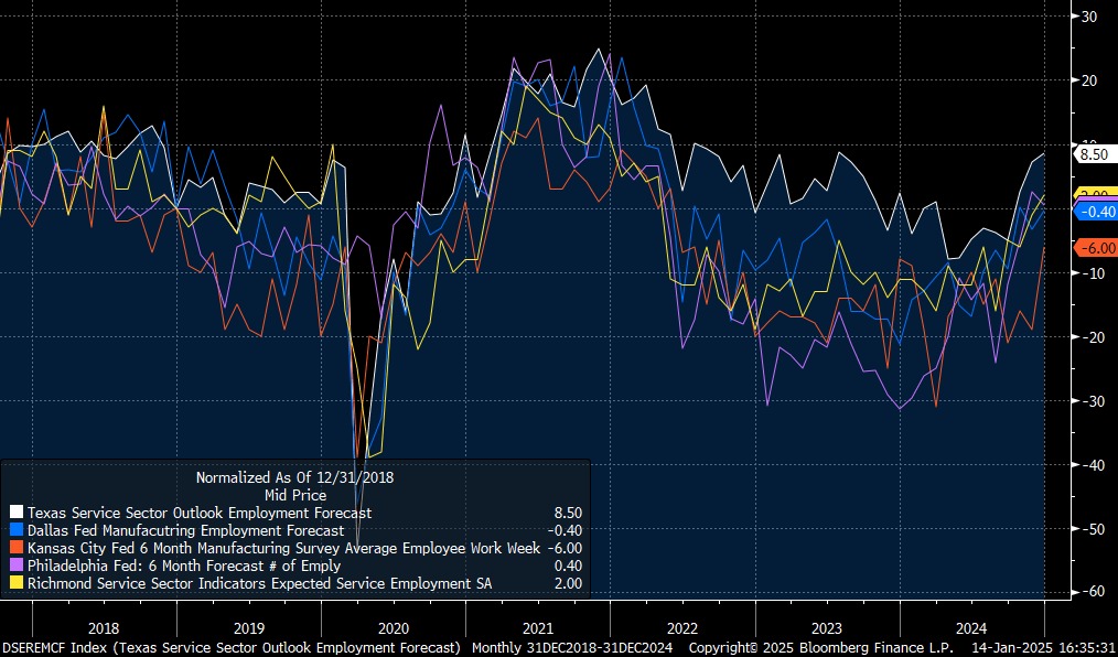 Hiring expectations are also stronger in a number of other regional Fed surveys.