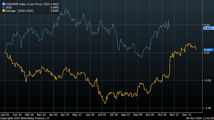 Bonds aren’t selling off post elections, despite large intraday volatility on the election date. 30-year yields are basically flat in the last 2 weeks.